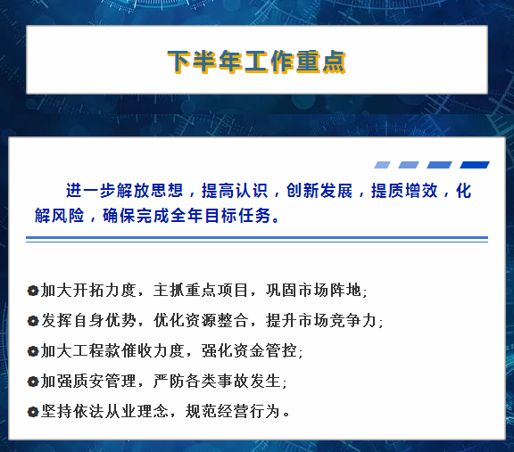 近日,我司召開(kāi)了年中經(jīng)營(yíng)工作會(huì )議。會(huì )議總結了上半年度經(jīng)營(yíng)工作情況,分析了當前經(jīng)濟發(fā)展形勢,進(jìn)一步明確了下半年度工作重點(diǎn)。